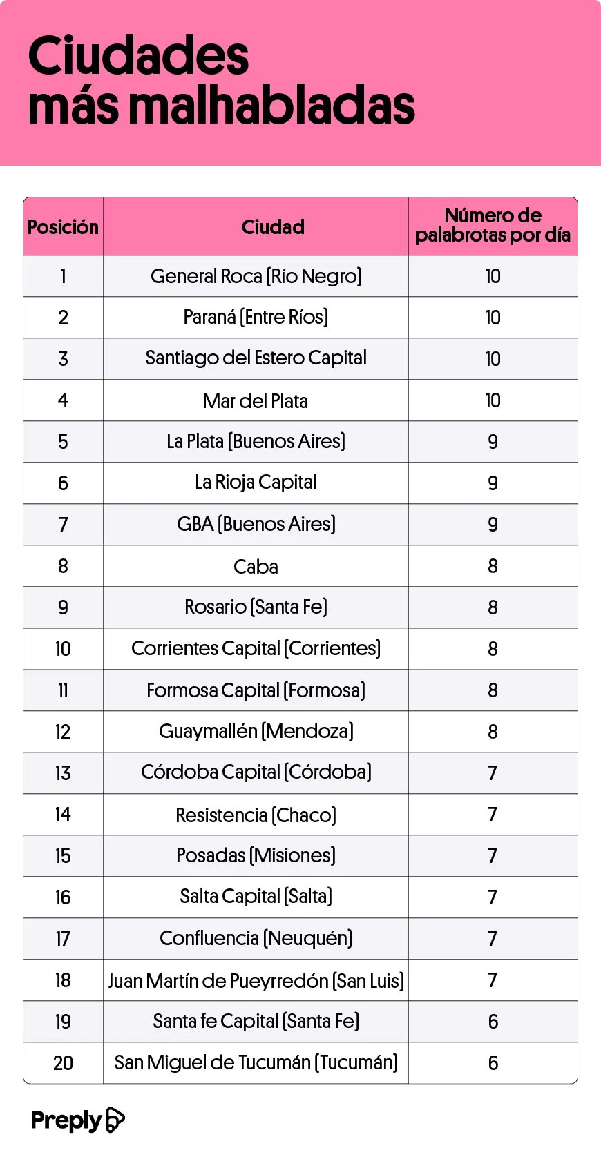 Según un reciente estudio de Preply, destacada plataforma de aprendizaje de idiomas que facilita la conexión entre tutores y cientos de miles de estudiantes en 180 países, se estima que el argentino promedio dice un poco más de 8 insultos al día. Aunque la presencia de este fenómeno lingüístico depende de la región, las ciudades que dicen mayor número de malas palabras al día son: General Roca (10), Paraná (10), Santiago del Estero Capital (10), Mar del Plata (10), La Plata (9), la Ciudad de La Rioja (9) y Gran Buenos Aires (9).