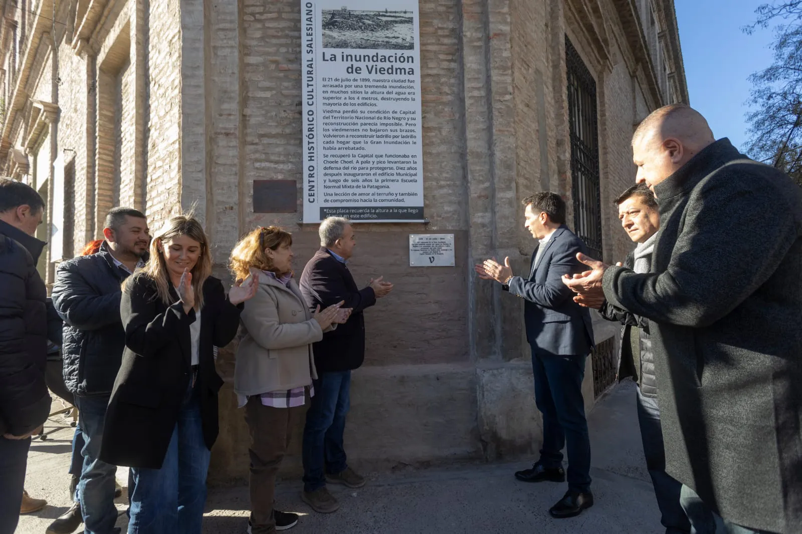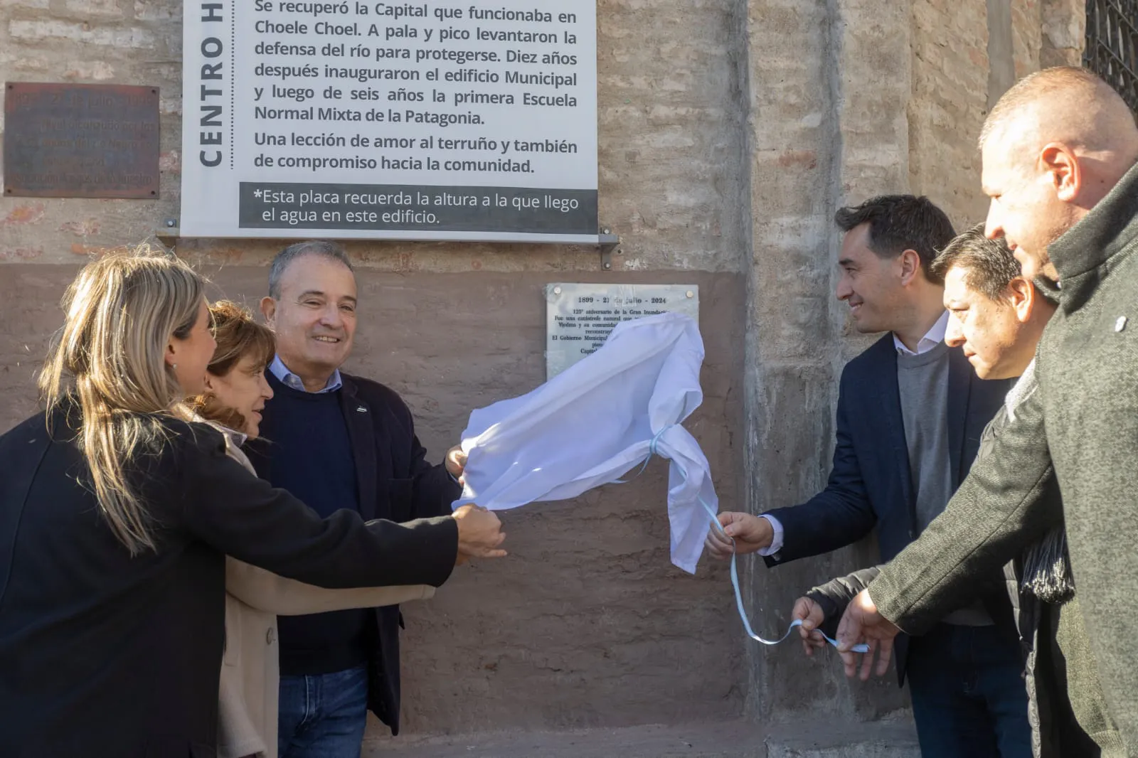 Durante la ceremonia, se descubrió una placa en la esquina de Colón y Rivadavia, al pie de la torre del reloj salesiano, donde otra placa ya indicaba la altura que alcanzó el agua durante el desastre.